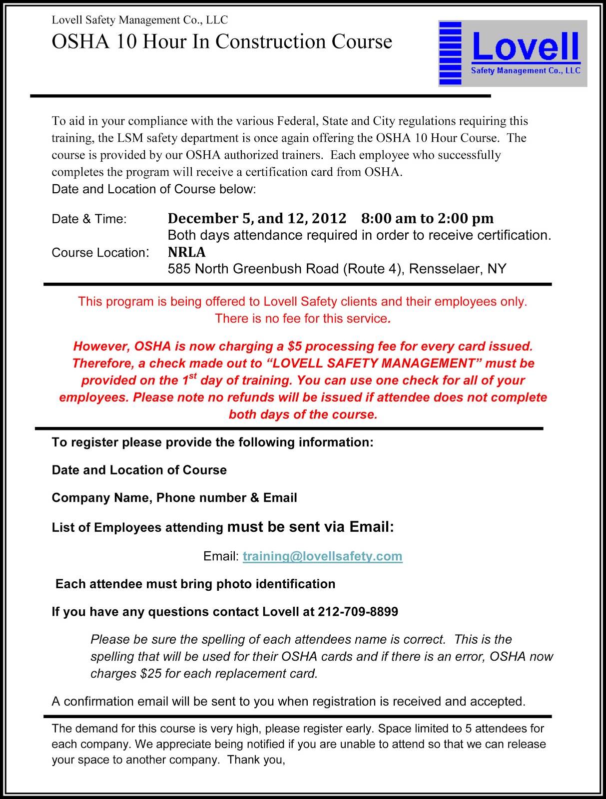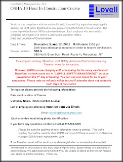 Save the Date! Another OSHA 10-Hour In Construction Course, Rennselaer, NY, December 5th and 12th, 2012.