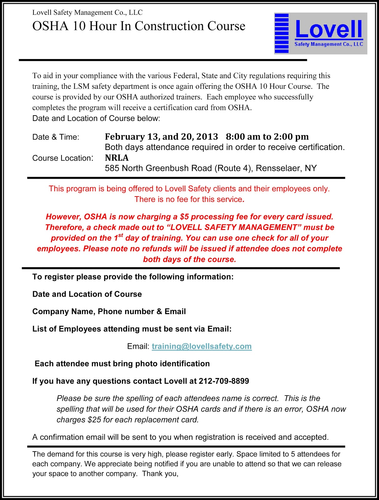 Save the Date! The OSHA 10-Hour In Construction Course, Rensselaer, NY, February 13th and 20th, 2013.