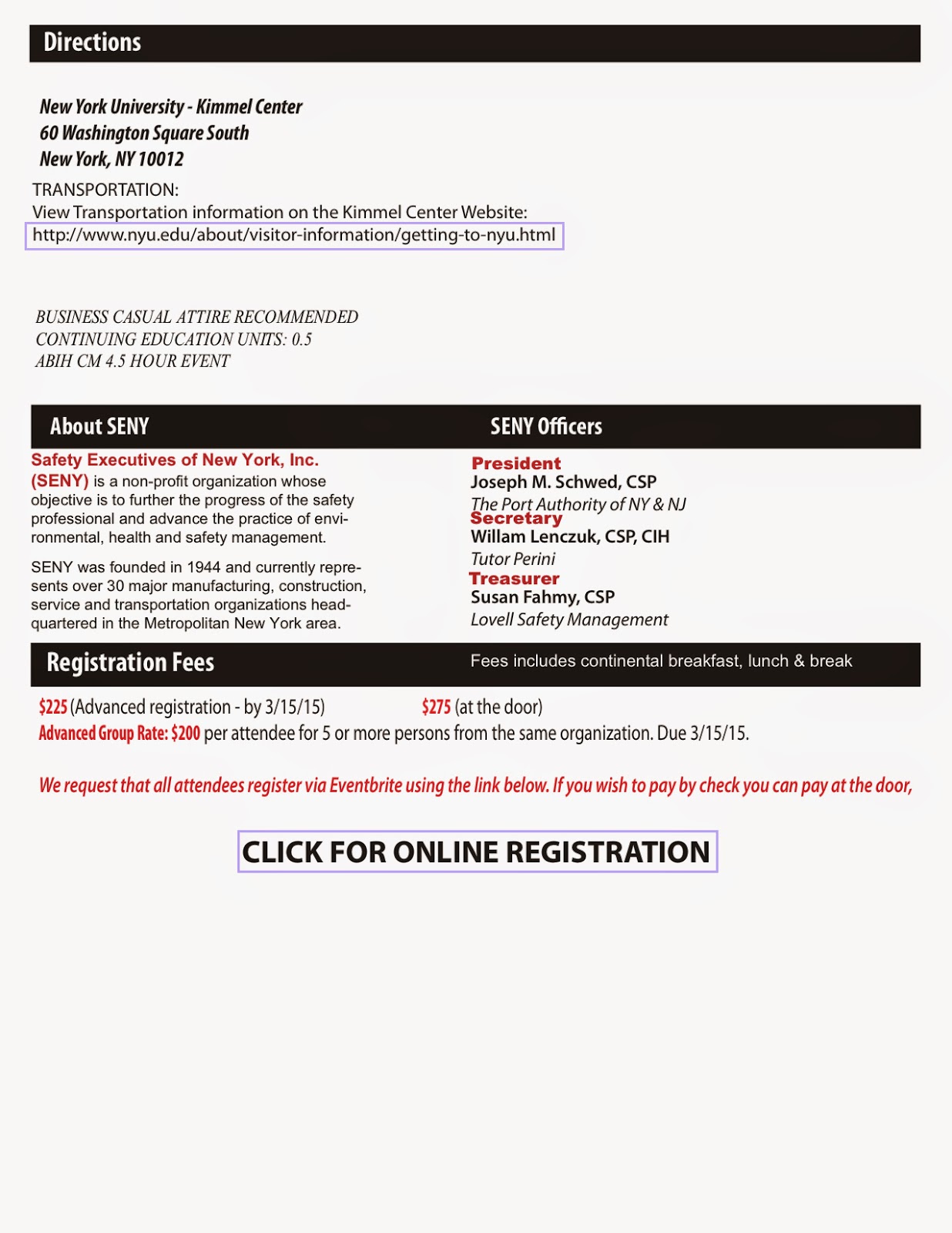 Safety Executives of New York 70th Annual Professional Development Conference Tuesday, March 24, 2015 8:00 am – 4:00 pm at New York University’s Kimmel Center