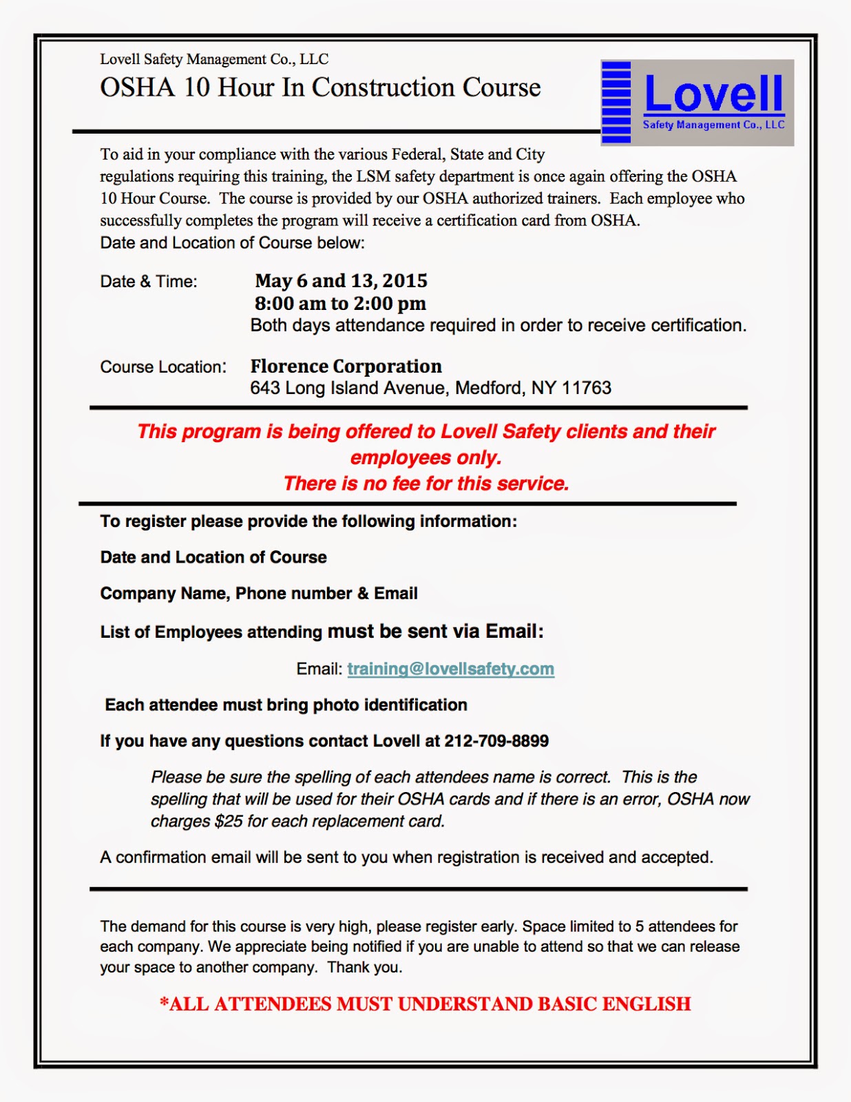 To aid in your compliance with the various Federal, State and City regulations requiring this training, the LSM safety department is once again offering the OSHA 10 Hour Course. The course is provided by our OSHA certified instructors. Each employee who successfully completes the program will receive a certification card from OSHA.