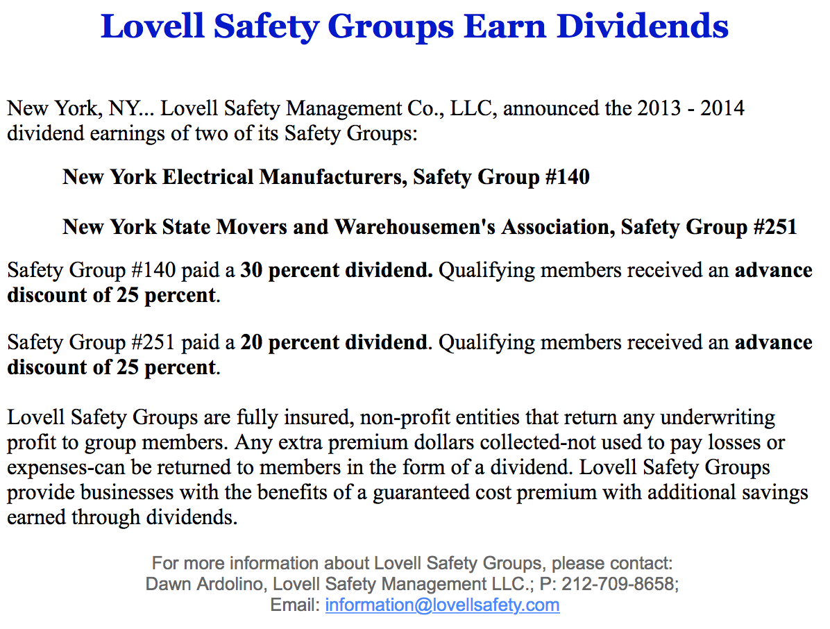 Dividend News from Lovell Safety ManagementSeptember 15, 2015/in Uncategorized/by Lovell Safety ManagementGreat news from Lovell, Dividend Numbers are up from last year. https://lovellsafety.com/wp-content/uploads/2022/05/Lovell_Logo-small-Recovered-2-300x117.png 0 0 Lovell Safety Management https://lovellsafety.com/wp-content/uploads/2022/05/Lovell_Logo-small-Recovered-2-300x117.png Lovell Safety Management2015-09-15 10:09:002024-08-14 10:06:35Dividend News from Lovell Safety Management