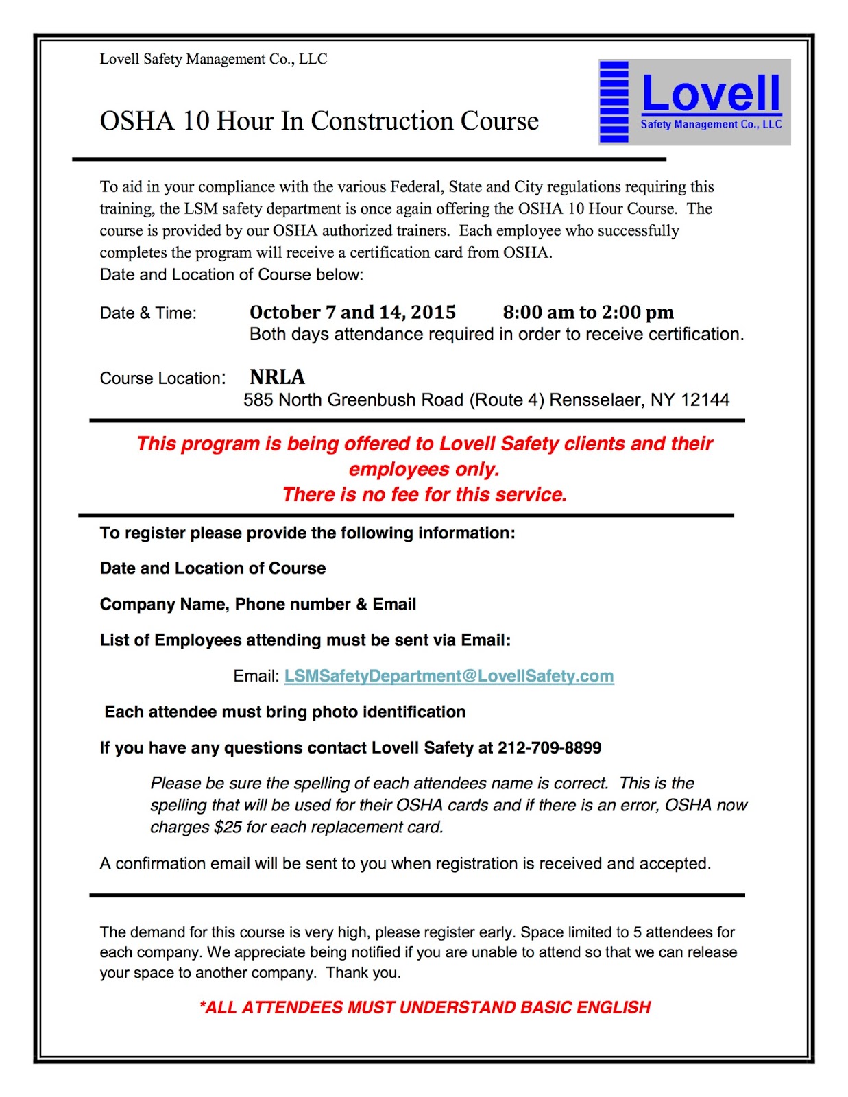 To aid in your compliance with the various Federal, State and City regulations requiring this training, the LSM safety department is once again offering the OSHA 10 Hour Course. The course is provided by our OSHA certified instructors. Each employee who successfully completes the program will receive a certification card from OSHA.