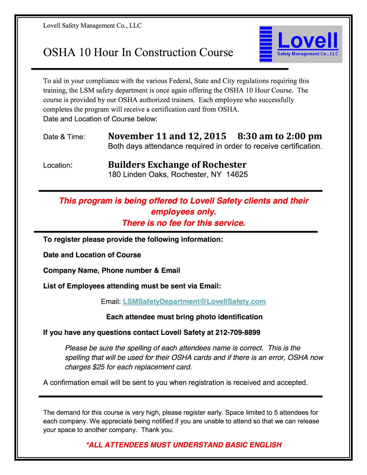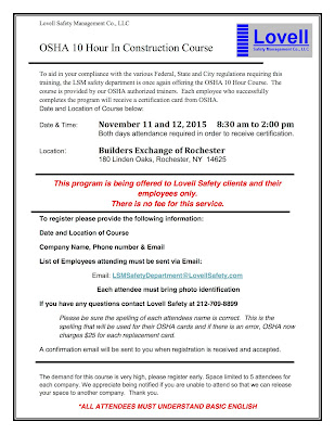 To aid in your compliance with the various Federal, State and City regulations requiring this training, the LSM safety department is once again offering the OSHA 10 Hour Course.  The course is provided by our OSHA certified instructors. Each employee who successfully completes the program will receive a certification card from OSHA.