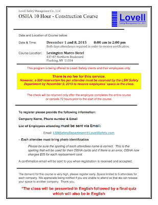 To aid in your compliance with the various Federal, State and City regulations requiring this training, the LSM safety department is once again offering the OSHA 10 Hour Course.  The course is provided by our OSHA certified instructors. Each employee who successfully completes the program will receive a certification card from OSHA.