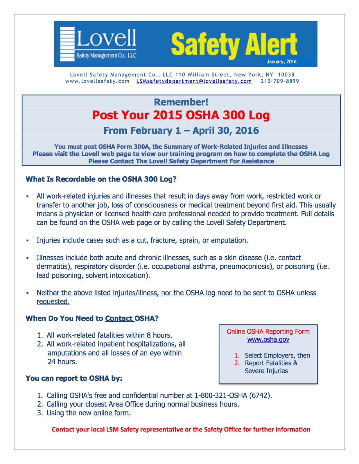Please remember to post your 2015 OSHA 300A summary log from February 1 – April 30, 2016. You can find assistance on how to complete your log, as well as OSHA reporting and notification requirements, on the attached newsletter.
