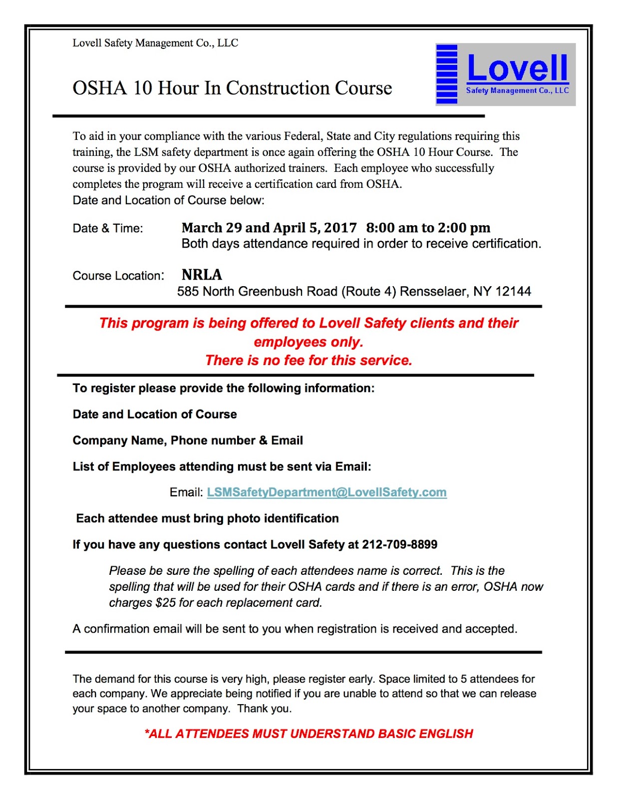 To aid in your compliance with the various Federal, State and City regulations requiring this training, the LSM safety department is once again offering the OSHA 10 Hour Course. The course is provided by our OSHA certified instructors. Each employee who successfully completes the program will receive a certification card from OSHA.