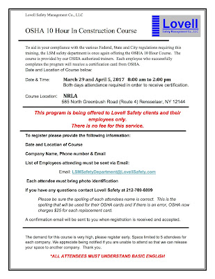 OSHA 10 Hour Construction Course March 29 and April 5, 2017 Rensselaer NY