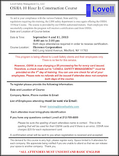 Save the Date! The OSHA 10-Hour In Construction Course, Medford, NY, September 4 and 11, 2013.